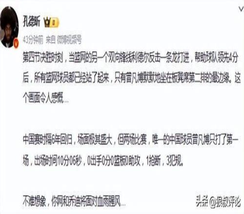 根据现场媒体人“孔德昕”报道,第四节决胜时刻,当篮网的另一个双向锋线利德尔反击一条龙打进,帮助球队领先4分后,所有篮网球员都已经站了起来,只有曾凡博默默地坐在板凳席第二排的最边缘。这个画面令人感慨…