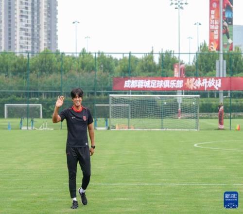9月8日,成都蓉城足球俱乐部在球队训练基地举行媒体开放日活动,成都蓉城队主教练徐正源向媒体记者致意。新华社发