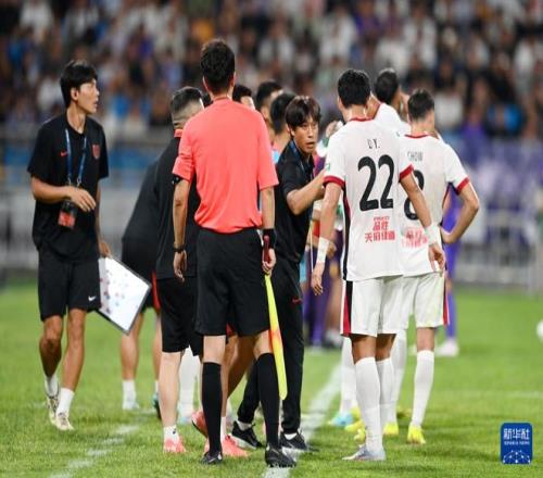 7月18日,成都蓉城队主教练徐正源(中)在场边指导球员。新华社发