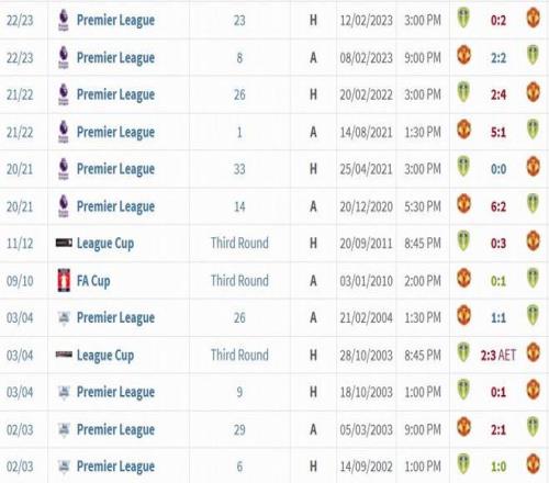 据统计,曼联近9次在联赛对阵利兹联无一败绩,取得6胜3平。上次曼联联赛不敌利兹联还要追溯至23年前:2002/03赛季英超联赛第6轮,利兹联在主场1-0小胜。