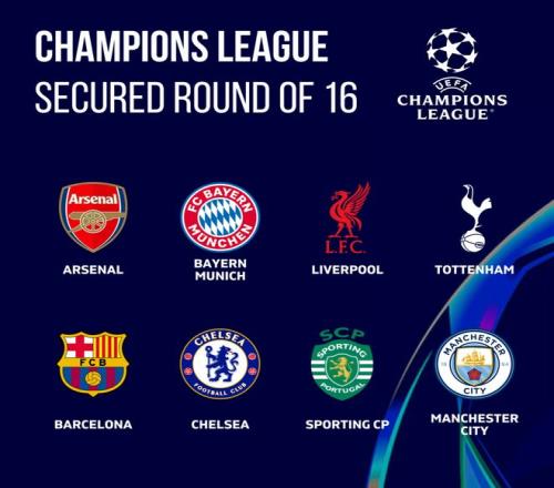 直通16强的8队分别为:阿森纳、拜仁、利物浦、热刺、巴萨、切尔西、葡萄牙体育、曼城。
