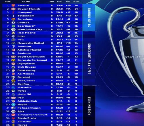 北京时间1月29日,2025-26赛季欧冠联赛阶段末轮18场角逐全部结束。而本赛季欧冠直通16强的8支队伍、参加淘汰赛附加赛的16支队伍也全部出炉。