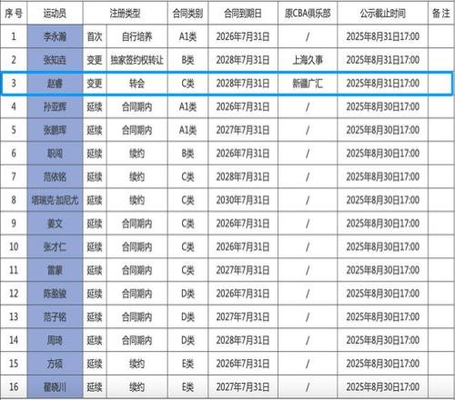 注册表显示,赵睿正式从新疆男篮转会北京男篮,合同类别为C类,合同到期日为2028年7月31日。